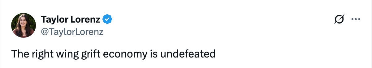 Taylor Lorenz — former Washington Post, New York Times and Daily Beast “journalist” — writes: “The right wing grift economy is undefeated.”